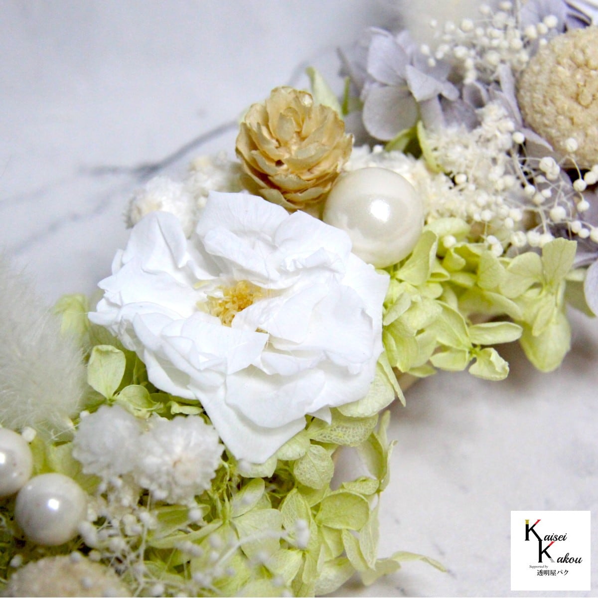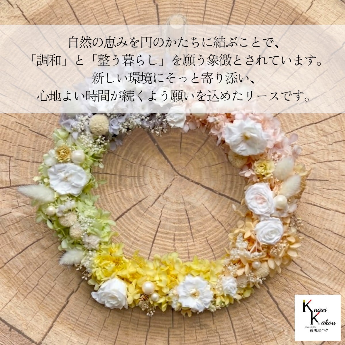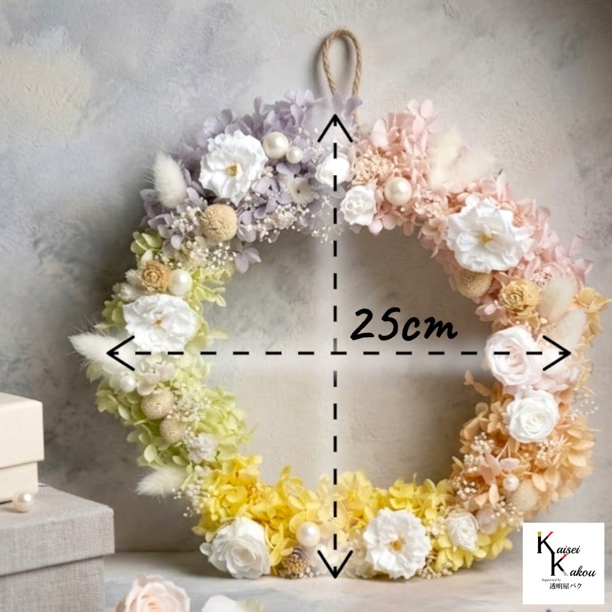 「プリザーブドフラワーリース パステルミスト 25cm」 母の日 プレゼント プリザーブドフラワー リース 花 ギフト 結婚式 送別会 花 退職祝い 男性 定年 誕生日 結婚祝い お返し 卒業式 卒園式 ブリザーブドフラワー 全て自然素材を使ったプリザーブドフラワーのリースです。 サイズ:直径約25cm淡い虹色がふわりと色づく、繊細なアジサイの花びらと、優雅に咲くバラが重なり合い、まるで光をまとったようなプリザーブドフラワーのリースです。淡い虹色には「希望が静かに満ちていく」という意味があり、アジサイとバラが象徴する“絆”と“やさしい愛”を静かに重ねています。プリザーブドフラワーならではの瑞々しさを長く保ち、時を重ねても色褪せない美しさを楽しめる一品です。自然の恵みを円のかたちに結ぶことで、「調和」と「整う暮らし」を願う象徴とされています。新しい環境にそっと寄り添い、心地よい時間が続くよう願いを込めたリースです。大切な方への特別な贈り物としても、自分自身を労わる上質なインテリアとしてもふさわしい、優雅な存在感を放つリースです。--------------------------------------------------年齢や性別を問わず、プリザーブドフラワーは誰にでも喜ばれる贈り物。お手入れ簡単で長持ちするため、大切な家族や友人、職場の方へのギフトに最適です。--------------------------------------------------取扱いの注意プリザーブドフラワーは湿気をとても嫌います。湿度の高い場所では枝や茎の切り口や表面から保存液や染料が染み出すことがあり、衣服などを汚す恐れがあります。ご使用の際には充分ご注意ください。※花材は季節によって少し変わる場合がございます。※なるべくふんわりと梱包いたしますが、配送による破損、潰れ、ほころびなどが生じることがございます。ご心配な方は宅配便をご指定下さい。※配送の都合上、商品を箱に直接梱包することもございます。※配送の都合上、使えない根元の部分はカットする場合があります。重量はカット前の重量となります。※高温多湿の場所では染料が切り口や表面からもれることがありますので、ご注意ください。※上記内容におけます返品交換は承れませんので、あらかじめご了承ください。 5