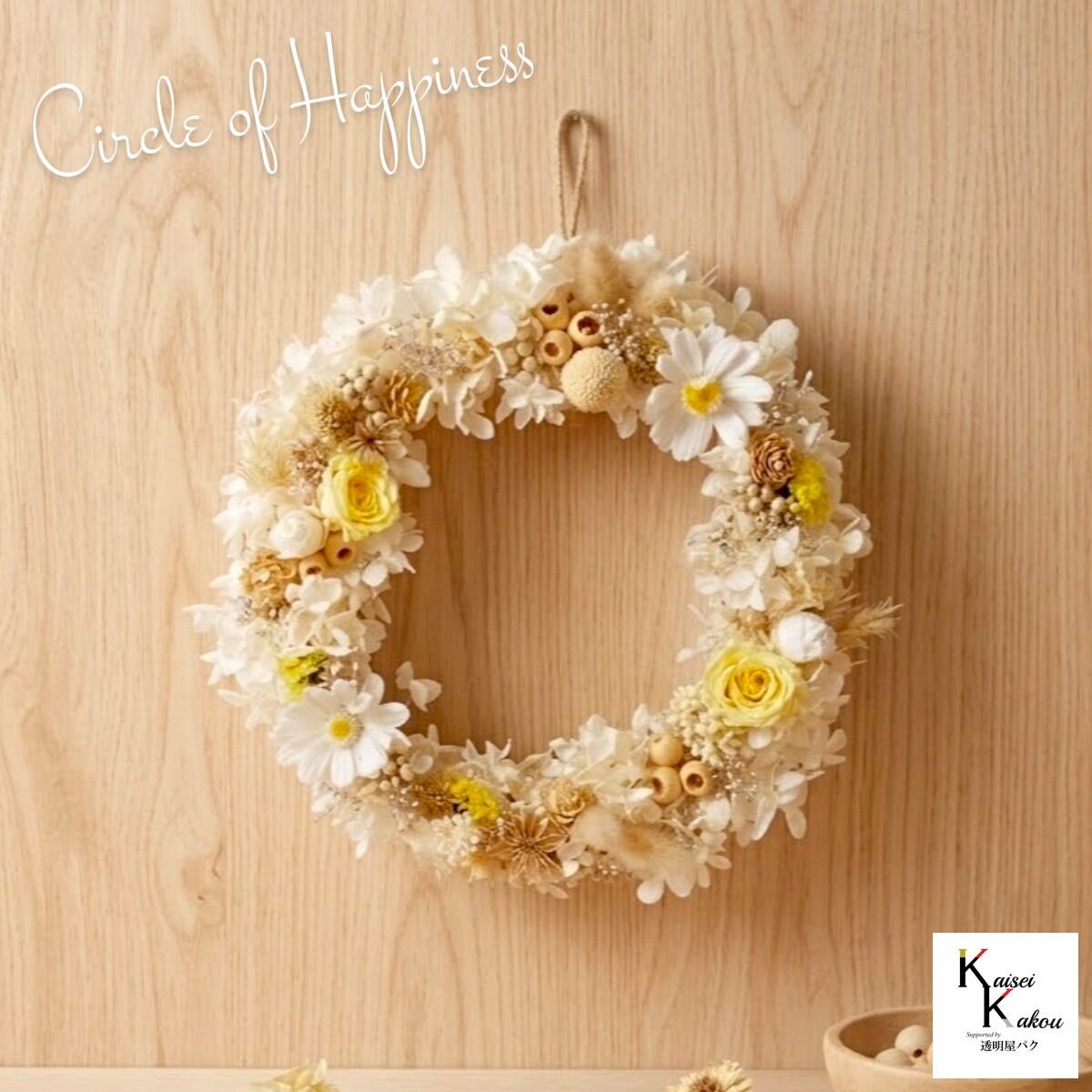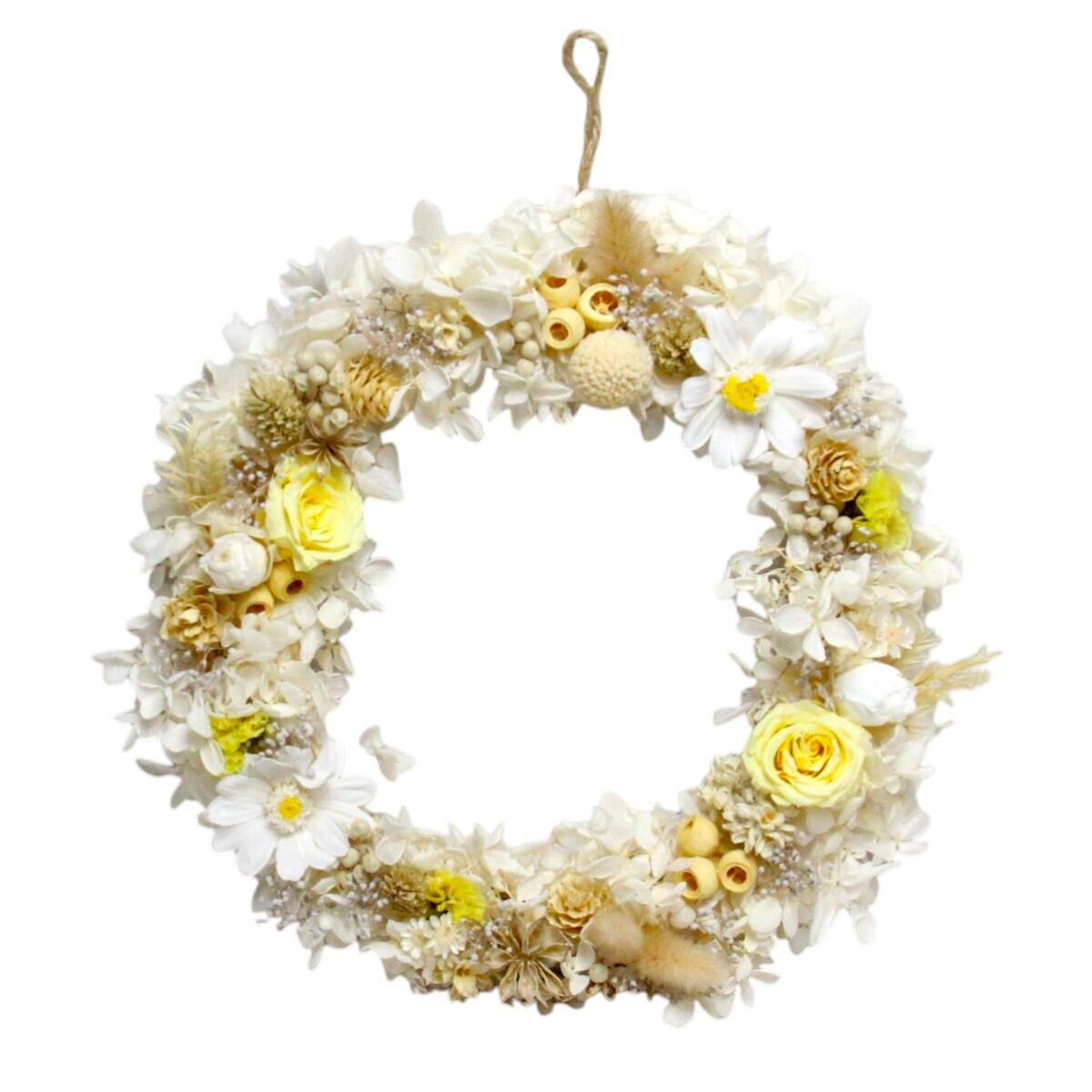 「プリザーブドフラワーリース サンシャイン 21cm」 母の日 プレゼント プリザーブドフラワー リース 花 ギフト 結婚式 送別会 花 退職祝い 男性 定年 誕生日 結婚祝い お返し 卒業式 卒園式 ブリザーブドフラワー 全て自然素材を使ったプリザーブドフラワーのリースです。 サイズ:直径約21cm黄色のバラは「希望」や「温かさ」を象徴する花。白いアジサイとともに並ぶその姿には、日々にそっと光を届けるような前向きな意味が重なります。このリースには、小さな光が心を照らし、穏やかな明るさが続きますように」という願いを込めています。プリザーブドフラワーならではの瑞々しさを長く保ち、時を重ねても色褪せない美しさを楽しめる一品です。自然の恵みを円のかたちに結ぶことで、「調和」と「整う暮らし」を願う象徴とされています。新しい環境にそっと寄り添い、心地よい時間が続くよう願いを込めたリースです。大切な方への特別な贈り物としても、自分自身を労わる上質なインテリアとしてもふさわしい、優雅な存在感を放つリースです。--------------------------------------------------年齢や性別を問わず、プリザーブドフラワーは誰にでも喜ばれる贈り物。お手入れ簡単で長持ちするため、大切な家族や友人、職場の方へのギフトに最適です。--------------------------------------------------取扱いの注意プリザーブドフラワーは湿気をとても嫌います。湿度の高い場所では枝や茎の切り口や表面から保存液や染料が染み出すことがあり、衣服などを汚す恐れがあります。ご使用の際には充分ご注意ください。※花材は季節によって少し変わる場合がございます。※なるべくふんわりと梱包いたしますが、配送による破損、潰れ、ほころびなどが生じることがございます。ご心配な方は宅配便をご指定下さい。※配送の都合上、商品を箱に直接梱包することもございます。※配送の都合上、使えない根元の部分はカットする場合があります。重量はカット前の重量となります。※高温多湿の場所では染料が切り口や表面からもれることがありますので、ご注意ください。※上記内容におけます返品交換は承れませんので、あらかじめご了承ください。 5