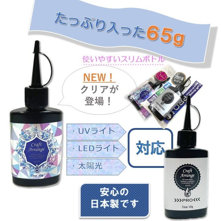 商品名: クラフトアレンジ UVレジン液 65g スリムボトル内容量: 65gカラー: クリア硬化時間の目安・LEDライト(波長405nm):約3分・UVランプ(9W使用時):約3分・太陽光:約10分※注型厚、素材、天候により硬化時間は若干の差異がございます。※LEDライトは、光の強さ、波長などをご確認の上、ご使用下さい。注意事項・開封後は、なるべく早くお使いください。・使用時は換気行って下さい。・本製品は食べられません。小児の手に届かない所に保管して下さい。・目に入った場合は、直ちに多量の水で洗い流して、医師の診断を受けて下さい。・ご使用時は手袋などをご使用下さい。・皮膚に付着した場合は、直ちに布などで拭き取り、水で洗い流して下さい。・ご使用中に身体に痒み、かぶれなどが発生した場合は、使用を中止して下さい。・直射日光を避け、25℃以下の暗い場所に保管して下さい。・低刺激・低臭気ではありますが、硬化方法により煙(蒸気)や臭気が出る場合があります(個人差もございます)。 換気ができる場所でご使用ください。