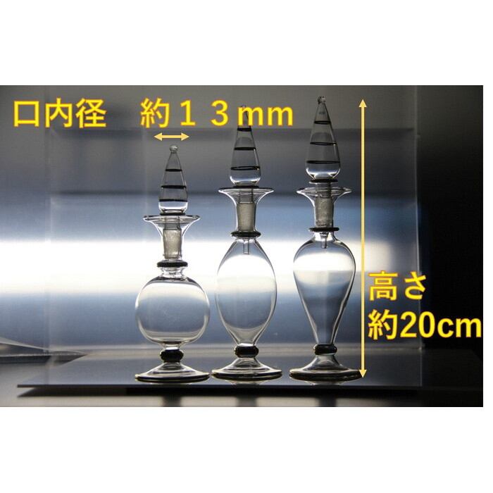 一つひとつ吹き、作り上げた香水瓶(パフュームボトル)です。 価格は1本分です。真ん中ふっくら球体上側ふっくらお好みのハーバリウムお作りください。ほかにも、好みの香水をいれるとゆっくりと揮発して、香りを楽しむこともできます。 一輪挿しにすることもできますし、用途はさまざまです。 商品詳細 伝統的な吹きガラスの製法で作っております。 フタには密閉性はございませんので、内容液をいれたまま傾けることがないようにお願いします。接着してお使いください。ハンドメイド品につき、細かな装飾(金メッキや波模様を含む)や形、大きさ、色味が異なります。また、小傷等ある場合もございます。製品はとてもデリケートなため、接触、圧力、温度変化により、塗装やメッキがダメージを受けることがございます。お取り扱いには十分にご注意ください。全く同じもののお届けはできませんので、あらかじめご了承ください。 【全体サイズ】 本製品はハンドメイド品のため、世界に同じものはひとつとて、ありません。 【素材】本体:ガラス色付きをご希望の場合は1本+500円で承ります。下記の色をご指定いただき、オーダーくださいませ。イエローレッドブルーグリーンパープルその他の色も調合可能です。※色付きは受注生産となりますので、発送までにお時間をいただきます。