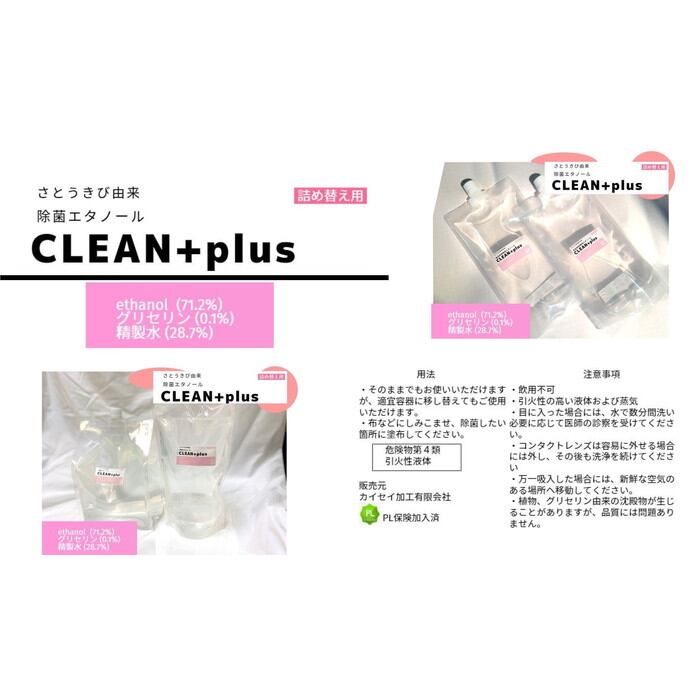 除菌エタノールオリジナルブランドのクリーンプラス。通常のアルコール製剤より、甘い香りが特徴の製品です。詰め替えやすいパウチ袋となっております。ethanol (71.2%)グリセリン(0.1%)精製水(28.7%)日本薬局方消毒用エタノール同等濃度品(アルコール度数として73.9〜78.4vol%程度)スプレー等の噴霧により除菌効果が期待できます。大腸菌、黄色ブドウ球菌を、わずか15秒で死滅することができます!(第三者 検査機関 株式会社静環検査センター(静岡県))パッケージは予告なく変更となる場合がございます。別途スプレー等はご用意ください。手や指、身の回りの手摺やドアノブ、テーブルなど総合除菌剤として幅広くご使用頂けます。安全対策・容器を密栓すること・熱、火花、高温のような着火源から遠ざける。応急処理・火災に際しては適切な消化方法をとること・目に入った場合には、水で数分間洗うこと・コンタクトレンズは容易に外せる場合には外し、その後も洗浄を続けること・吸入した場合には、新鮮な空気のある場所へ移動すること500mlパックもしくは1000mlパックでのお届けです。袋はお選びいただけません。形状は購入数量や在庫により写真と異なる場合もございますので、何卒宜しくお願い致します。※グリセリン由来の浮遊物や、サトウキビ由来の成分が混入することがございますが、品質には問題ありません。必ず説明文をお読みの上、ご購入ください。エタノール製剤は水とは異なり、密度約0.8g/mlでございます。容量が少ないご指摘を多数いただきますが、重量=容積ではございませんので、何卒誤解なきよう、お願い致します。推奨使用期限は3年間です。ラベルは別添えでお届けする場合もございます。