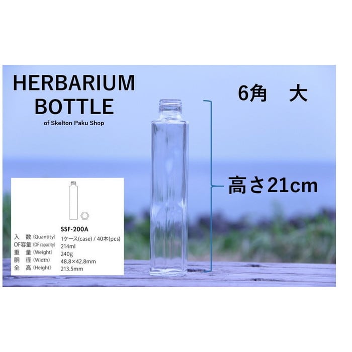 ハーバリウムによく使われる透明瓶。上から見ると6面体のボトル!すらりと伸びた形もスタイリッシュです。もちろんハーバリウム用ではなく、食品適合瓶ですので、さまざまな用途でお使いいただけます。