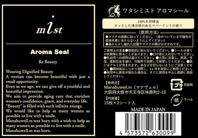 100%天然精油で医療用としても人気のあるマスクに貼るアロマシール♪スッとした清涼感のある「ペパーミントの香り」とエレガントでフローラルな「ベルガモットの香り」の2種類をご用意しています!天然精油使用なので、合成香料と比べると香りは長持ちしないかもしれません。ただ、天然ならではの柔らかい香りに包まれますので、対面接客を行う業種の方にはご好評をいただいています?看護師さん・歯医者さん・サロンさんなどマスクで接客される方は、是非一度お試し下さい?〈使用方法〉1.マスクの表面に貼ってください。 (香のついている不織布が直接皮膚に当たらないようにしてください)2.鼻から少し離れた位置やマスクの隅がおすすめです。内容量:15枚×2シート入り4袋製造国:日本