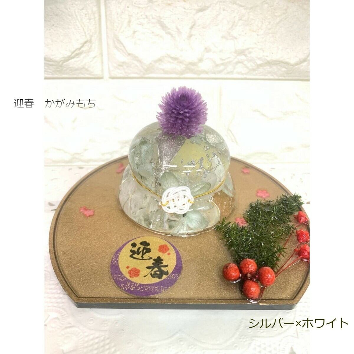 ハーバリウム鏡餅かがみもちりうむ鏡餅の中を優雅に舞うお花の華やかさとガラスのような透明感が特徴です。新年を迎える素敵なインテリアアイテムとしてお土産やご自宅用に。本体サイズ約8×約8×高さ約5.5cmカラーレッドグリーンイエローブルーホワイト×シルバー台座クリア半月盆ゴールド半月盆ブラック上記の色5色、台座3パターンの計15種類をご用意しております。タイトルの「」内の組み合わせと写真をそれぞれ組み合わせて、ご参照ください。《素材》本体:固まるハーバリウム(スーパーボールのような弾力性のあるシリコン)花材(ドライ又はプリザーブドフラワー)土台:アクリル又はお盆