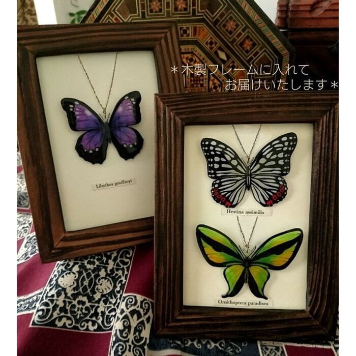 *素材*プラスチック(プラバン)、レジン、チェーン、金具*サイズ*蝶部分 よこ約5.0~6.7cm たて約4.7~5.2cmチェーンの長さ55一部、ピアスになってしまっている画像もございますが、こちらはネックレスです。ピアスご希望の方は別ページよりご注文ください。*種類(カラー)*・ゴクラクトリバネアゲハ (グリーン)・クラウディナミイロタテハ (レッド)・ペレイデスモルフォ (ライトブルー)・イナズマシジミタテハ (ブラック)・アンビカコムラサキ (ネイビー)・キマダラマルバネアゲハ (オレンジ)・アカホシゴマダラ (ホワイト)・ムラサキテングチョウ (パープル)3枚目の画像のような木製フレームに入れて、学名をつけお届けいたします。着けない時はインテリアにもすることが可能です。フレームの入荷の関係で、予告なく似たものに変更する場合がございますのでご了承ください。*ご注意*ひとつひとつ手描き、手作りの為、サイズや色に多少の差や気泡が入ることがあります。また、負担や熱が加わると破損してしまうことがあります。お取り扱いには十分ご注意ください。