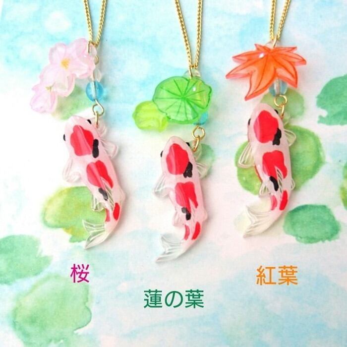 移ろいゆく季節を泳ぐ錦鯉のネックレスです。クリアなプラバンにひとつひとつ描いて制作しております。表面はレジンでぷっくりツヤツヤです。*種類*・「ノーマル」…錦鯉2匹が優雅に泳ぐ・「桜」…春、満開に咲いた桜とそれを見上げる錦鯉・「蓮の葉」…夏、水面に浮いた蓮の葉とその間を泳ぐ錦鯉・「紅葉」…秋、鮮やかな紅葉とその下を優雅に泳ぐ錦鯉*素材:プラスチック、レジン、ビーズ、金具、ネックレスチェーン*サイズ:鯉 大約3.0cm 小約2.0cm ネックレスチェーン45cm 「ギフトラッピング(+500円)」を選択いただければ、箱から手作りの包装でお届けいたします。箱、リボンのカラーはおまかせください。*変更など通常はチェーンの長さは45cmですが、無料で55cmにも変更可能です。またゴールドの金具部分やチェーンは、シルバーに変更可能です。ご希望のかたのみ、備考欄にご記入ください。*ご注意ひとつひとつ手描き、手作りの為、サイズや色に多少の差や気泡があります。また、必要以上の力や熱が加わると破損してしまうことがあります。お取り扱いにご注意ください。