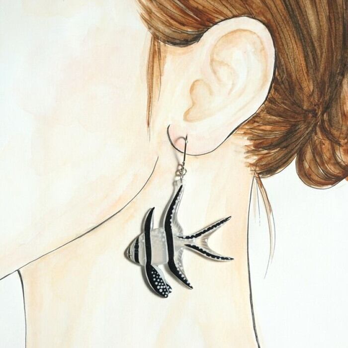 熱帯魚プテラポゴン・カウデルニーのピアス/イヤリングです。白黒に、特徴的な体の形がステキなプテラポゴン・カウデルニー。和名だと「アマノガワテンジクダイ」ストライプと白い点々模様が天の川のようでキレイですね。体の形が星形に見えるからだとも言われます。水族館やアクアリウムで人気の熱帯魚です。プラバンに色鉛筆でひとつひとつ手描きし、細部まで仕上げました。表面はレジンでぷっくりツヤツヤです。体は半透明、尾びれなどは透明でとても涼しげです。左右セットでの販売です。よこ4cm たて4cm ※多少の誤差はあります(耳のたての長さ5.5cm)素材:プラスチック、レジン、金具購入オプション*選択しない(ピアスのまま)*サージカルステンレスピアス +00*ネジバネ式イヤリングに変更 +00*樹脂ピアスに変更 +0*樹脂イヤリングに変更 +00*ラッピング+100円手作りのプレゼントボックスでお届けいたします。プロフィールに画像がございますのでご覧ください。箱、リボンのカラーはおまかせください。通常用もプレゼント用もオリジナルの台紙付きです。着けない時はそのまま飾っていただけます。