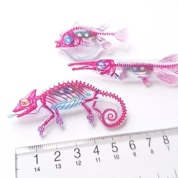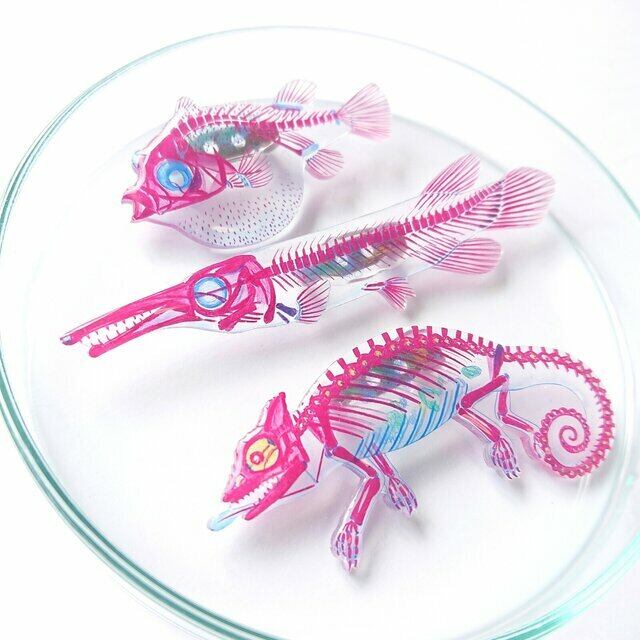 透明標本をイメージしたブローチ第2弾です。透明標本とは、特殊な薬品を使って筋肉を透明化し、硬骨を赤く、軟骨を青く染色した標本です。その不思議で繊細な標本をクリアなプラバンに描きました。ひとつひとつ色鉛筆で描き、細部まで忠実に仕上げてあります。表面はレジンでぷっくりツヤツヤです。素材:プラスチック、レジン、金具[購入オプション]プレゼント用ボックス(+100円)を選択いただければ手作りの包装でお届けいたします。プロフィールに画像がございますのでご覧ください。箱、リボンのカラーはおまかせください。