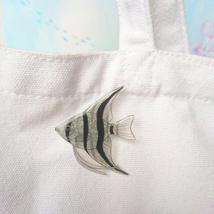 エンゼルフィッシュのブローチです。熱帯魚エンゼルフィッシュをクリアなプラバンでつくりました。表面はレジンでぷっくりツヤツヤです。印象的な魚モチーフ、シンプルな服や帽子などに合わせてみてはいかがですか?よこ約3.7cm たて約5.0cm ピン2.0cm素材:プラスチック、レジン、ラメ、金具[購入オプション]プレゼント用ラッピング(+100円)を選択いただければ手作りの包装でお届けいたします。プロフィールに画像がございますのでご覧ください。箱、リボンのカラーはおまかせください。プレゼント用も通常包装も、台紙にのせてお届けいたします。着けない時はそのまま飾っても。