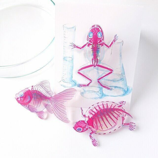 透明標本をイメージしたブローチ第2弾です。透明標本とは、特殊な薬品を使って筋肉を透明化し、硬骨を赤く、軟骨を青く染色した標本です。その不思議で繊細な標本をクリアなプラバンに描きました。ひとつひとつ色鉛筆で描き、細部まで忠実に仕上げてあります。表面はレジンでぷっくりツヤツヤです。素材:プラスチック、レジン、金具[購入オプション]プレゼント用ボックス(+100円)を選択いただければ手作りの包装でお届けいたします。箱、リボンのカラーはおまかせください。