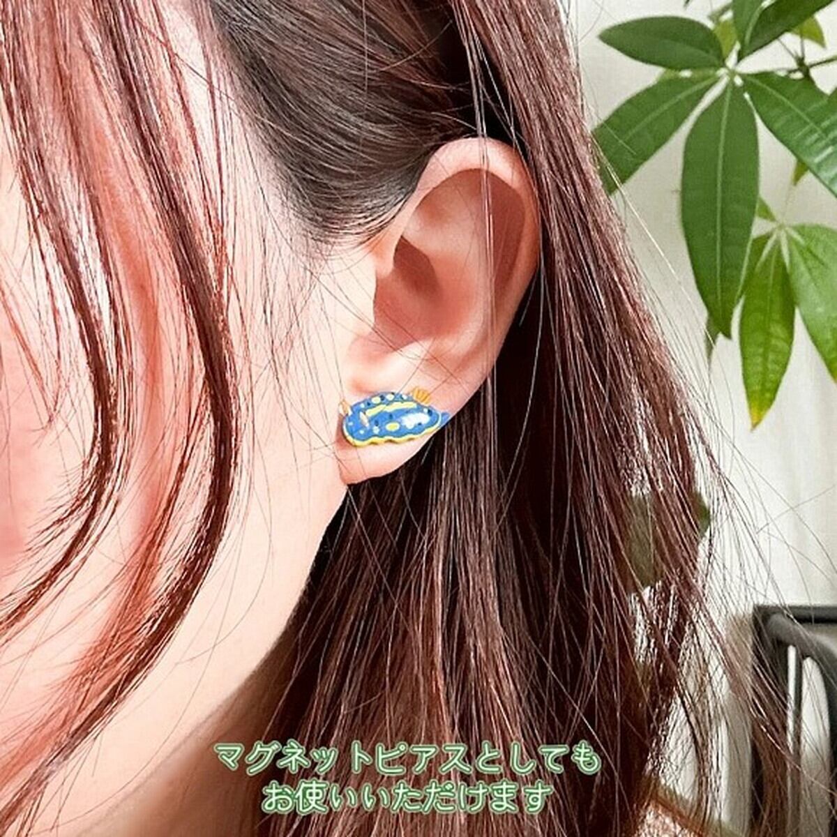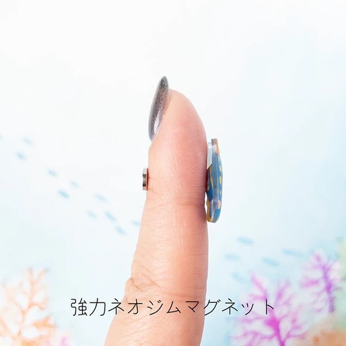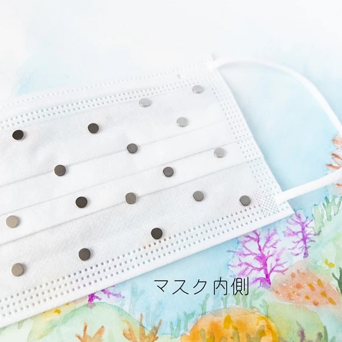 ちっちゃくてカラフルなウミウシのマグネットです。お好きなウミウシを2匹お選びください。プラバンに色鉛筆でひとつひとつ手描きし制作しております。表面はレジンでぷっくりツヤツヤです。素材:プラスチック、レジン、ネオジムマグネット着色:色鉛筆、顔料インクマスクを外側(ウミウシ)と内側の2つのマグネットで挟んで留めるかたちです。お食事などでマスクを外す際は、紛失防止にマスクケースを使用してください。強力なネオジムマグネットを使用しておりますので画像のようにマグネットピアスとしてもお使いいただけます。ホワイトボード、冷蔵庫にも。ウミウシ名のページが2ページ(全24種類)がありますのでその中からお好きな2匹をご選択ください。※選択肢にない種類は、メッセージでお申し付けください。※選択肢でうまくお選びできない場合は、メッセージでお知らせください。種類が多いため、下記のようにお願い致します。OK…シロウミウシ、シンデレラNG…例えば、白のウミウシ、1ページ目のウミウシ※「アオウミウシ」と「アオミノウミウシ」がいます!※「シロ」ではじまるのが多数います!ご注意ください。同じウミウシを複数個もご購入いただけます。ご指定がない限り、ウミウシの向きはランダムに選ばせて頂きます。2匹が向き合う形になります。【大きさ】ウミウシ1.9センチ〜2.2センチ マグネット直径0.5センチ 厚さ0.1センチ【ラッピング】プレゼント用ラッピングをご選択いただければ手作りの包装でお届けいたします。箱、リボンのカラーはおまかせください。通常用もプレゼント用もオリジナルの台紙付きです。着けない時はそのまま飾っていただけます。*************************商品について*ひとつひとつ手描き、手作りの為、サイズや色に多少の差や気泡がありますがご理解ください。強力なネオジムマグネットを使用しております。小さなお子様、ペットの誤飲には細心の注意をお願い致します。誤飲した可能性がある場合は、早急に病院で診察を受けて下さい。電子医療機器を使用している方、金属アレルギーをお持ちの方は着用をしないでください。*お取り扱いについて*繊細な造りですので必要以上の力や熱が加わると破損してしまうことがありますのでご注意ください。着用後は汚れなどをやわらかい布で拭き、直射日光の当たらない場所で保管してください。