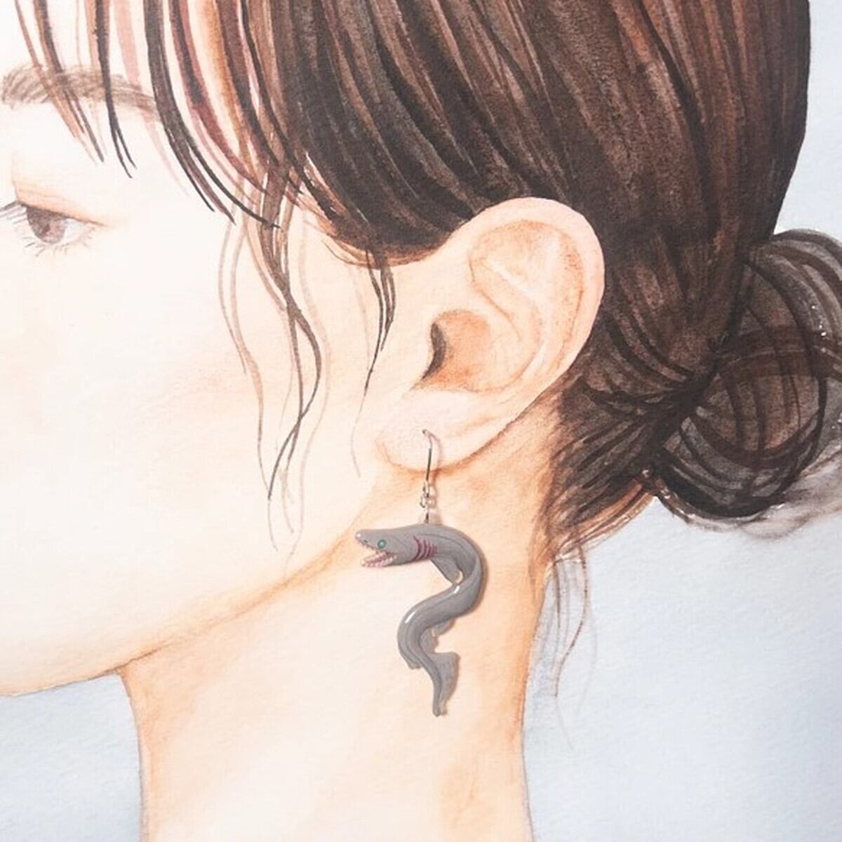 深海鮫ラブカのピアス/イヤリングです。原始的なエラが美しい「生きた化石」ともいわれるサメです。プラバンに色鉛筆でひとつひとつ手描きで制作しております。表面はレジンでぷっくりツヤツヤです。素材:プラスチック、レジン、金具着色:色鉛筆大きさ:たて4.0センチ よこ2.5センチ (金具は含めず)手描きの為、多少の誤差はございます。*変更など*[ピアス金具の変更] ネジバネ式イヤリングへの変更+100円 樹脂ピアスへの変更+50円 樹脂イヤリングへの変更+200円サージカルステンレスピアスへの変更+200円※変更ご希望の方は選択肢にてお選びください。※うまくお選びできない場合はメッセージでお知らせください。[ラッピング]ギフトラッピング(+100円)を選択いただければ、箱から手作りの包装でお届けいたします。箱、リボンのカラーはおまかせください。ギフト用も通常包装も、手描きの台紙にのせてお届けいたします。****************************************商品について*ひとつひとつ手描き、手作りの為、サイズや色に多少の差や気泡がありますがご理解ください。金属アレルギーをお持ちの方、可能性のある方は樹脂ピアス樹脂イヤリングをおすすめいたしますが、その他のつなぎ部品に金属を使用しているのでご注意ください。*お取り扱いについて*繊細な造りですので必要以上の力や熱が加わると破損してしまうことがありますのでご注意ください。着用後は汚れなどをやわらかい布で拭き、直射日光の当たらない場所で保管してください。