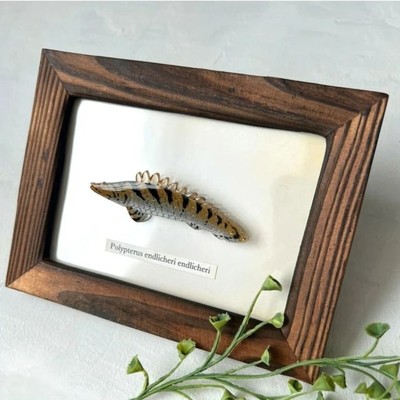 ポリプテルス・エンドリケリーのブローチです。ポリプテルスは恐竜が生きていた時代からほとんど姿を変えずに生き続けている古代魚でギザギザな背ビレが特徴的です。大きな鱗は、1枚1枚色鉛筆で手描きしております。角度で裏側のラメがキラっと光ります。表面はレジンでぷっくりツヤツヤです。木製のフレーム付きですのでそのままインテリアとして飾っていただけます。フレームは入荷によって似たようなものに変更させていただく場合があります。*素材プラスチック、レジン、金具、ラメ*サイズ・よこ約8.0センチ たて約2.5センチ ブローチ金具2.5センチ[金具の変更]マグネットをご希望方は選択肢にてマグネット( +\100 )をご選択ください。画像のような小さなマグネットを2つ裏にレジン接着いたします。※変更ご希望の方は選択肢にてお選びください。※うまくお選びできない場合はメッセージでお知らせください。在庫は全てブローチで制作しております為、1,2日ほど多くお時間を頂く場合がございます。お急ぎの場合は購入前にご相談下さい。****************************************商品について*ひとつひとつ手描き、手作りの為、サイズや色に多少の差や気泡がありますがご理解ください。金属アレルギーをお持ちの方、可能性のある方は直接肌に触れるような着用をお控えください。*お取り扱いについて*繊細な造りですので必要以上の力や熱が加わると破損してしまうことがありますのでご注意ください。着用後は汚れなどをやわらかい布で拭き、直射日光の当たらない場所で保管してください。