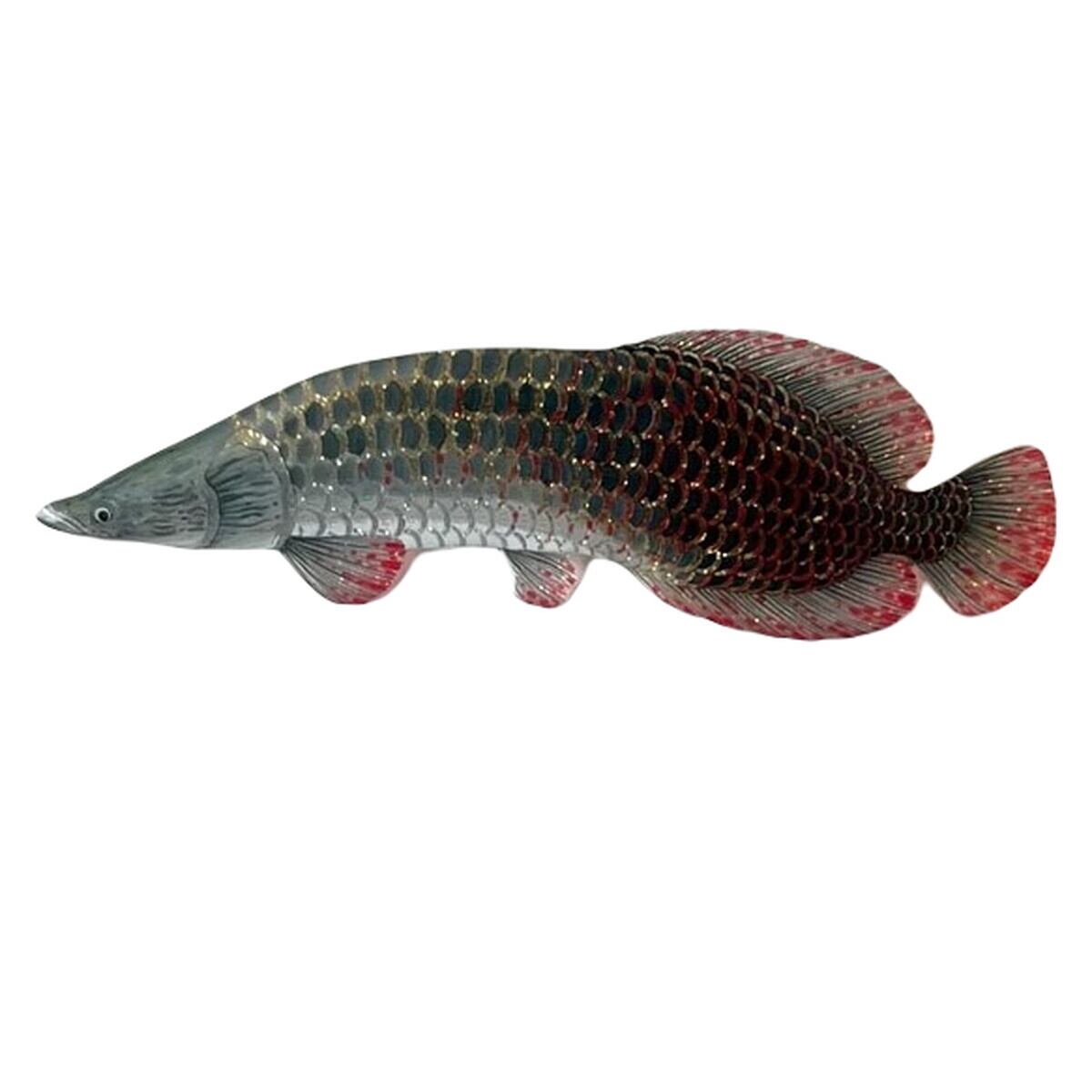 ピラルクのブローチです。ピラルクは恐竜が生きていた時代からほとんど姿を変えずに生き続けている古代魚です。世界最大にもなる淡水魚で、メタリックな体と赤いヒレがキレイです。特徴的な大きな鱗は、1枚1枚色鉛筆で手描きし、何度も色を重ねて深みのある色合いにしております。角度で裏側のラメがキラっと光ります。表面はレジンでぷっくりツヤツヤです。木製のフレーム付きですのでそのままインテリアとして飾っていただけます。フレームは入荷によって似たようなものに変更させていただく場合があります。*素材プラスチック、レジン、金具、ラメ*サイズ・よこ約9.3センチ たて約2.8センチ ブローチ金具2.5センチ[金具の変更]マグネットをご希望方は選択肢にてマグネット( +¥100 )をご選択ください。画像のような小さなマグネットを2つ裏にレジン接着いたします。※変更ご希望の方は選択肢にてお選びください。※うまくお選びできない場合はメッセージでお知らせください。在庫は全てブローチで制作しております為、1,2日ほど多くお時間を頂く場合がございます。お急ぎの場合は購入前にご相談下さい。****************************************商品について*ひとつひとつ手描き、手作りの為、サイズや色に多少の差や気泡がありますがご理解ください。金属アレルギーをお持ちの方、可能性のある方は直接肌に触れるような着用をお控えください。*お取り扱いについて*繊細な造りですので必要以上の力や熱が加わると破損してしまうことがありますのでご注意ください。着用後は汚れなどをやわらかい布で拭き、直射日光の当たらない場所で保管してください。