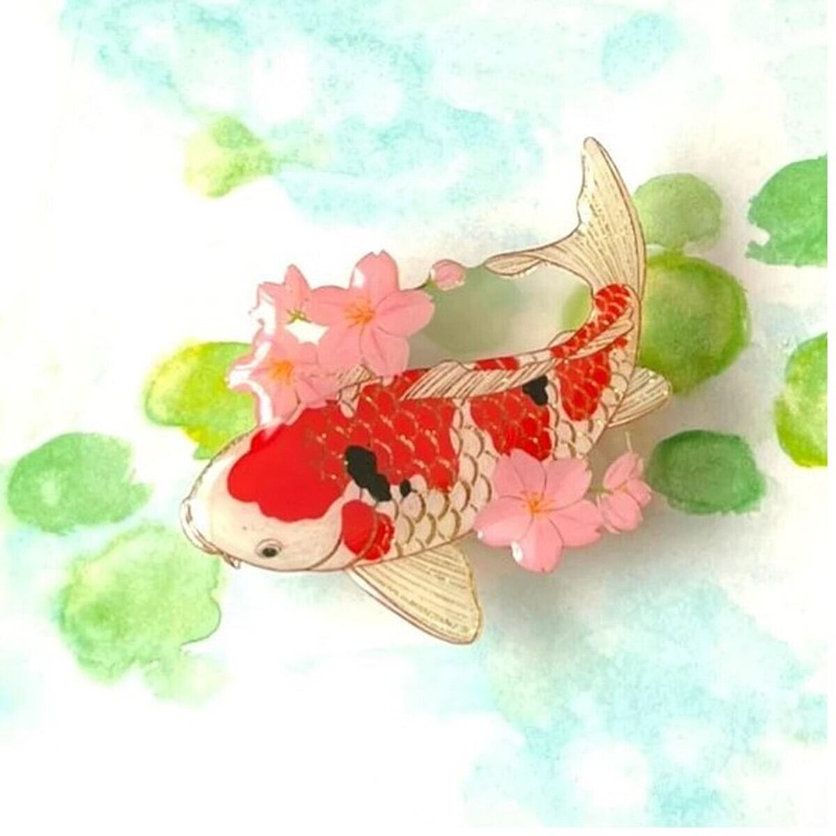 桜が浮かぶ池を優雅に泳ぐ、錦鯉の帯留めです。クリアなプラバンにひとつひとつ手描きで制作しました。鱗やヒレはクリアな部分を残して描き、裏面のゴールドのラメが角度でキラキラ見える仕様です。表面はレジンでぷっくりツヤツヤです。大きめで存在感のある和風な鯉モチーフです。暗い色の帯にもよく合います。素材:プラスチック(プラバン)、レジン、ラメ、金具大きさ:たて約5.0センチ よこ約5.2センチ ブローチピン2.5センチ[ラッピング]ギフトラッピング(+100円)を選択いただければ、箱から手作りの包装でお届けいたします。箱、リボンのカラーはおまかせください。ギフト用も通常包装も、手描きの台紙にのせてお届けいたします。水草の絵柄はどちらかになります。****************************************商品について*ひとつひとつ手描き、手作りの為、サイズや色に多少の差や気泡がありますがご理解ください。金属アレルギーをお持ちの方、可能性のある方は直接肌に触れるような着用をお控えください。*お取り扱いについて*繊細な造りですので必要以上の力や熱が加わると破損してしまうことがありますのでご注意ください。着用後は汚れなどをやわらかい布で拭き、直射日光の当たらない場所で保管してください。