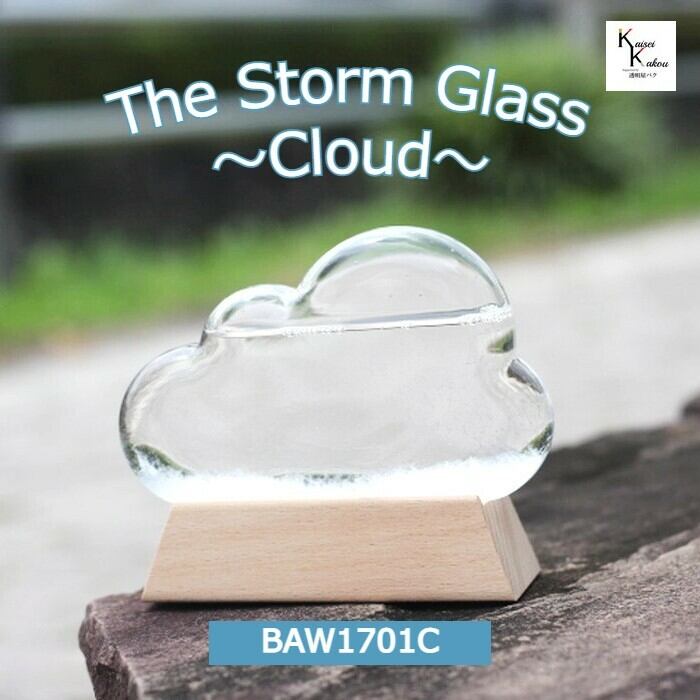 天気予報に!?ストームグラスクラウド型弊社ではこちらのストームグラスをはじめとした商品を取り扱っております。大きさ約:高さ110×幅130×奥行50mm素材ホウケイ酸ガラス、水、エタノール、天然樟脳、天然木台ストームグラスは19世紀初頭にヨーロッパにて航海時に気象情報を予測するのに使われていました。複数の化学薬品をアルコールに溶かしてガラス容器に詰めたもので、天候によって結晶の様子が変化すると言われています。英国海軍のロバート・フィッツロイ提督が、この装置を詳細に研究したことから、別名「フィッツロイの気象計」とも呼ばれています。実際には気象状況と液体内部の結晶化の関連性については、100%ではありません。正確な気象情報を予測する為にはお使いできませんが、周りの気象環境の変化によって液体と結晶がユニークに変化しますので、観賞用のインテリアとしてお楽しみ下さい。注意事項○環境によって、結晶が変化しますので、写真のような状態が保たれるわけではございません。夏の暑い日には一時的に透明になりますが、再び結晶は現れます。無くなることはありません。○直射日光を避けて保管してください。○加熱や急冷(電子レンジ)はご遠慮ください○内用液にはアルコールや硝酸カリウム、塩化アンモニウムなどが入っております。火器の近くに置かないでください。小児の手の届かないところに保管し、誤飲しないようにお願いします。割れてしまい、手などについた場合には水でよく洗ってください。〇ハンドメイドガラス製品につき小傷や黒ずみがある場合がございます。ご了承ください。〇万一、破損した場合は水拭きをしてください。内用液の匂いがしますが、吸引しても問題ありません。〇ハンドメイド品につき細かな装飾や模様、大きさが写真と異なることがございます。結晶はごくゆっくりと変化します。年単位でお楽しみ下さい。