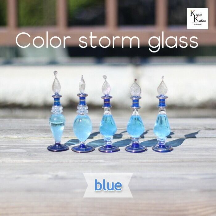 カラーストームグラス。お天気が予報できる管です。高さ約11cm±2cmひとつひとつ吹きガラスで作ったボトルに閉じ込めました。ボトルの形は上側ふっくら、真ん中ふっくら、下側ふっくらと3種類です。中世のヨーロッパの航海士たちがこのビンの結晶をみて天気を予想し、航海に役立てたと言われています。冬の雪や霜のときには、管の高い位置まで沈殿物が見え、とても白く、点状になります。夏のとても天気がよい日には沈殿物は管の非常に低い位置までしかできません。注意事項○環境によって、結晶が変化しますので、写真のような状態が保たれるわけではございません。夏の暑い日には一時的に透明になりますが、再び結晶は現れます。無くなることはありません。○直射日光を避けて保管してください。○加熱や急冷(電子レンジ)はご遠慮ください○内用液にはアルコールや硝酸カリウム、塩化アンモニウムなどが入っております。火器の近くに置かないでください。小児の手の届かないところに保管し、誤飲しないようにお願いします。割れてしまい、手などについた場合には水でよく洗ってください。〇ハンドメイドガラス製品につき小傷や黒ずみがある場合がございます。ご了承ください。〇先端部は特に折れやすいです。〇万一、破損した場合は水拭きをしてください。内用液の匂いがしますが、吸引しても問題ありません。〇ハンドメイド品につき細かな装飾や模様、大きさなどが写真と異なることがございます。〇色味につきましても写真と異なることがございます。光の加減や個人差もございますので、あらかじめご了承ください。〇ハンドメイド品につき在庫がない場合がございます。その場合は受注生産となり、発送に少々お時間いただきます。※クレオパトラストームグラスはカイセイ加工有限会社の登録商標です。模倣品の販売は固くお断りいたします。〇結晶はごくゆっくりと変化します。年単位でお楽しみ下さい。
