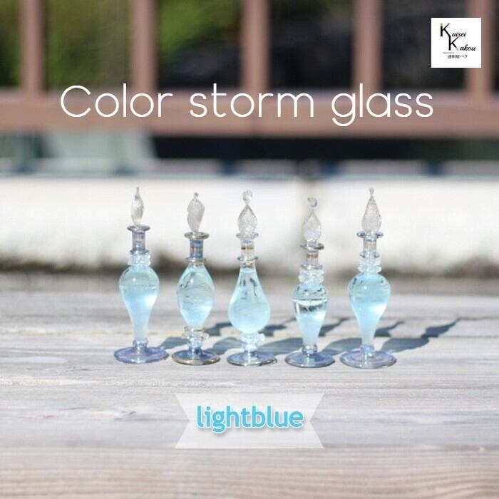 カラーストームグラス。お天気が予報できる管です。高さ約11cm±2cmひとつひとつ吹きガラスで作ったボトルに閉じ込めました。ボトルの形は上側ふっくら、真ん中ふっくら、下側ふっくらと3種類です。中世のヨーロッパの航海士たちがこのビンの結晶をみて天気を予想し、航海に役立てたと言われています。冬の雪や霜のときには、管の高い位置まで沈殿物が見え、とても白く、点状になります。夏のとても天気がよい日には沈殿物は管の非常に低い位置までしかできません。注意事項○環境によって、結晶が変化しますので、写真のような状態が保たれるわけではございません。夏の暑い日には一時的に透明になりますが、再び結晶は現れます。無くなることはありません。○直射日光を避けて保管してください。○加熱や急冷(電子レンジ)はご遠慮ください○内用液にはアルコールや硝酸カリウム、塩化アンモニウムなどが入っております。火器の近くに置かないでください。小児の手の届かないところに保管し、誤飲しないようにお願いします。割れてしまい、手などについた場合には水でよく洗ってください。〇ハンドメイドガラス製品につき小傷や黒ずみがある場合がございます。ご了承ください。〇先端部は特に折れやすいです。〇万一、破損した場合は水拭きをしてください。内用液の匂いがしますが、吸引しても問題ありません。〇ハンドメイド品につき細かな装飾や模様、大きさなどが写真と異なることがございます。〇色味につきましても写真と異なることがございます。光の加減や個人差もございますので、あらかじめご了承ください。〇ハンドメイド品につき在庫がない場合がございます。その場合は受注生産となり、発送に少々お時間いただきます。※クレオパトラストームグラスはカイセイ加工有限会社の登録商標です。模倣品の販売は固くお断りいたします。〇結晶はごくゆっくりと変化します。年単位でお楽しみ下さい。