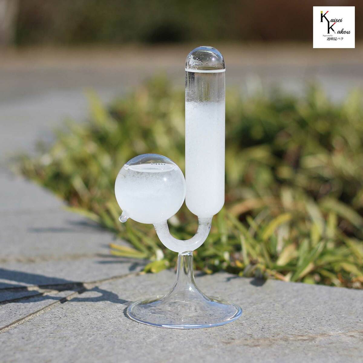 弊社ではこちらのストームグラスをはじめとした商品を取り扱っております。ストームグラスは19世紀初頭にヨーロッパにて航海時に気象情報を予測するのに使われていました。複数の化学薬品をアルコールに溶かしてガラス容器に詰めたもので、天候によって結晶の様子が変化すると言われています。英国海軍のロバート・フィッツロイ提督が、この装置を詳細に研究したことから、別名「フィッツロイの気象計」とも呼ばれています。実際には気象状況と液体内部の結晶化の関連性については、100%ではありません。正確な気象情報を予測する為にはお使いできませんが、周りの気象環境の変化によって液体と結晶がユニークに変化しますので、観賞用のインテリアとしてお楽しみ下さい。注意事項○環境によって、結晶が変化しますので、写真のような状態が保たれるわけではございません。夏の暑い日には一時的に透明になりますが、再び結晶は現れます。無くなることはありません。○直射日光を避けて保管してください。○加熱や急冷(電子レンジ)はご遠慮ください○内用液にはアルコールや硝酸カリウム、塩化アンモニウムなどが入っております。火器の近くに置かないでください。小児の手の届かないところに保管し、誤飲しないようにお願いします。割れてしまい、手などについた場合には水でよく洗ってください。〇ハンドメイドガラス製品につき小傷や黒ずみがある場合がございます。ご了承ください。〇先端部は特に折れやすいです。〇万一、破損した場合は水拭きをしてください。内用液の匂いがしますが、吸引しても問題ありません。〇ハンドメイド品につき細かな装飾や模様、大きさが写真と異なることがございます。結晶はごくゆっくりと変化します。年単位でお楽しみ下さい。