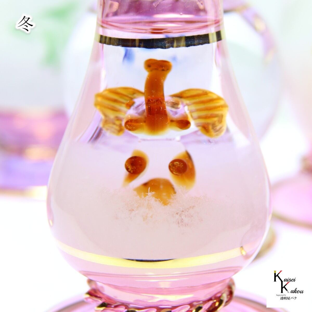 愛らしいどうぶつさんが見え隠れ♪一点物のストームグラスです。夏は動物が見え、冬は結晶に隠れます! 「一点物 どうぶつストームグラス わんちゃんブルースリム」犬 ドッグ ストームグラス 動物 アニマル お天気管 天気 気象計 香水瓶 エジプシャングラス ハンドメイド 手作り 愛らしいどうぶつさんが見え隠れ♪一点物のストームグラスです。夏は動物が見え、冬は結晶に隠れます! ひとつひとつ手作りされたエジプトガラスにストーム液を封じました。 それぞれ少しずつ表情の違う、他にひとつとない一点物のお品物です。 愛らしいどうぶつさんがお天気によって見え隠れ。 夏は動物が見え、冬は結晶に隠れます! サイズ:約 約 高さ22×台座直径6.5 cm 中世のヨーロッパの航海士たちがこのビンの結晶をみて天気を予想し、航海に役立てたと言われています。 周りの気象環境の変化によって液体と結晶がユニークに変化します。 冬の雪や霜のときには、管の高い位置まで沈殿物が見え、とても白く、点状になります。 夏のとても天気がよい日には沈殿物は管の非常に低い位置に留まります。 ----------------------------------------------------------------- ストームグラスは19世紀初頭にヨーロッパにて航海時に気象情報を予測するのに使われていました。 複数の化学薬品をアルコールに溶かしてガラス容器に詰めたもので、天候によって結晶の様子が変化すると言われています。 英国海軍のロバート・フィッツロイ提督が、この装置を詳細に研究したことから、別名「フィッツロイの気象計」とも呼ばれています。 実際には気象状況と液体内部の結晶化の関連性については、100%ではありません。 正確な気象情報を予測する為にはお使いできませんが、 周りの気象環境の変化によって液体と結晶がユニークに変化しますので、アクセサリーや観賞用のインテリアとしてお楽しみ下さい。 ----------------------------------------------------------------- 注意事項 ○環境によって、結晶が変化しますので、写真のような状態が保たれるわけではございません。夏の暑い日には一時的に透明になりますが、再び結晶は現れます。無くなることはありません。 ○直射日光を避けて保管してください。 ○加熱や急冷(電子レンジ)はご遠慮ください ○内用液にはアルコールや硝酸カリウム、塩化アンモニウムなどが入っております。火器の近くに置かないでください。小児の手の届かないところに保管し、誤飲しないようにお願いします。割れてしまい、手などについた場合には水でよく洗ってください。 〇ハンドメイドガラス製品につき小傷や黒ずみがある場合がございます。ご了承ください。 〇先端部は特に折れやすいです。 〇万一、破損した場合は水拭きをしてください。内用液の匂いがしますが、吸引しても問題ありません。 〇ハンドメイド品につき細かな装飾や、色、模様、大きさが写真と異なることがございます。特にピンク系、ブルー系は、ひとつひとつの色味が異なります。ご注意ください。 結晶はごくゆっくりと変化します。年単位でお楽しみ下さい。 5