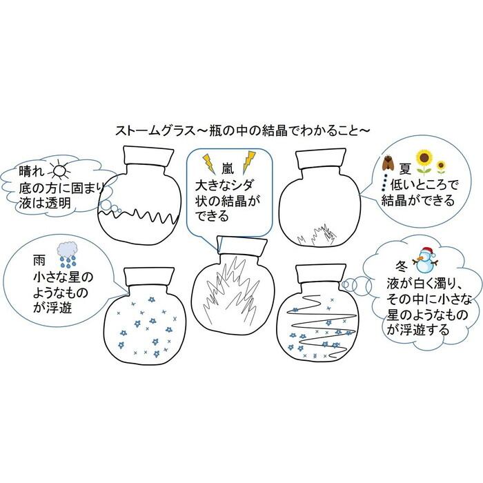 周りの気象環境の変化によって液体と結晶がユニークに変化します。 天気が分かる!「ストームグラス ミルキーホワイトキャップ SSE200」 天気管 天気 クリスマス ツリー フィッツロイ ミニ ボトル ウェザーグラス 天気 気象計グッズ インテリア インテリア小物 置物 瓶 小瓶 ガラス おもしろグッズ おもしろ雑貨 プレゼント 贈り物 周りの気象環境の変化によって液体と結晶がユニークに変化します。 置き場所は、玄関先がオススメ! *天気が分かるストームグラス *ミルキーホワイトキャップ 中世のヨーロッパの航海士たちがこのビンの結晶をみて天気を予想し、航海に役立てたと言われています。 冬の雪や霜のときには、管の高い位置まで沈殿物が見え、とても白く、点状になります。 夏のとても天気がよい日には沈殿物は管の非常に低い位置に留まります。 結晶はごくゆっくりと変化します。年単位でお楽しみ下さい。 ----------------------------------------------------------------- ストームグラスは19世紀初頭にヨーロッパにて航海時に気象情報を予測するのに使われていました。 複数の化学薬品をアルコールに溶かしてガラス容器に詰めたもので、天候によって結晶の様子が変化すると言われています。 英国海軍のロバート・フィッツロイ提督が、この装置を詳細に研究したことから、別名「フィッツロイの気象計」とも呼ばれています。 実際には気象状況と液体内部の結晶化の関連性については、100%ではありません。 正確な気象情報を予測する為にはお使いできませんが、 周りの気象環境の変化によって液体と結晶がユニークに変化しますので、アクセサリーや観賞用のインテリアとしてお楽しみ下さい。 ----------------------------------------------------------------- ○環境によって、結晶が変化しますので、写真のような状態が保たれるわけではございません。夏の暑い日には一時的に透明になりますが、再び結晶は現れます。無くなることはありません。 ○直射日光を避けて保管してください。 ○加熱や急冷(電子レンジ)はご遠慮ください ○内用液にはアルコールや硝酸カリウム、塩化アンモニウムなどが入っております。火器の近くに置かないでください。小児の手の届かないところに保管し、誤飲しないようにお願いします。割れてしまい、手などについた場合には水でよく洗ってください。 〇万一、破損した場合は水拭きをしてください。内用液の匂いがしますが、吸引しても問題ありません。 〇環境への配慮から梱包資材にはリサイクル品を用いますので、あらかじめご了承ください。 5