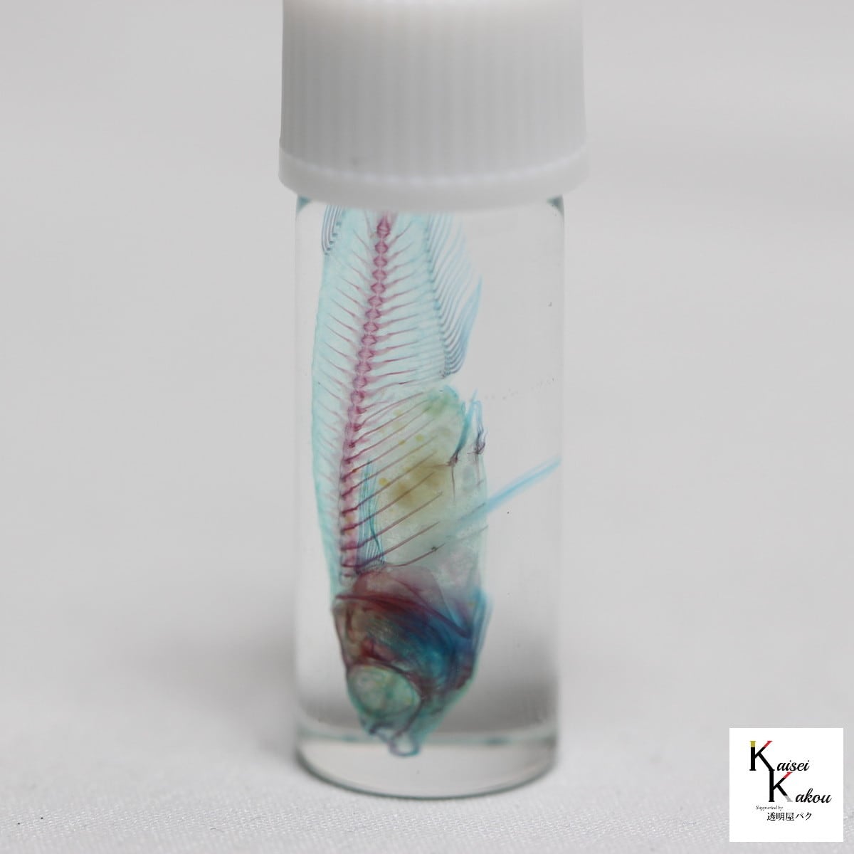 メダカの透明標本が入ったネックレス。インテリアにも。骨格の観察に。 「透明標本 メダカネックレス シルバー」 メダカ skelton スケルトン クリア 透明瓶 グリセリン 解剖 昆虫 ネックレス マグネット シール ファイル 化石 自由研究 パズル 工作 アクセサリー 理科 標本 研究 骨格 骨 インテリア 雑貨 メダカの透明標本が入ったネックレス。インテリアにも。骨格の観察に。 骨格を観察できるように特殊処理した透明標本。 ひとつひとつの複雑な骨を、その形や重なり具合を生時の立体構造として、しっかりと観察できます。 弊社で取り扱っている透明標本は、職人がひとつひとつ手作業で慎重に作製しております。そのため、作製した標本は世界に一つしかない完全オリジナル作品となります。 (1本分の価格となります。) こちらのページの商品は実際に送付するメダカの標本ではありませんので、ご了承ください。個体差やキャップの色やボトルの大きさが異なることがございます。 ※保管上の注意点※ 直射日光や高温多湿での保管は避けてください。色あせることがあります。 保存液にはグリセリンとチモールを使用しており、人体には無害ですが、皮膚などに付いた際にはよく洗い流してください。 火気に注意してください。 落下による衝撃でビンが破損する恐れがあります。そのため、グリセリンは瓶の容量の9割程度になっております。 子供やペット等が誤飲することのないように、手の届かないところに保管してください。 完全な密封をする事ができず、長時間寝かせた状態では、容器中のグリセリンが漏れる、もしくは標本がずれてしまうことがあります。 5
