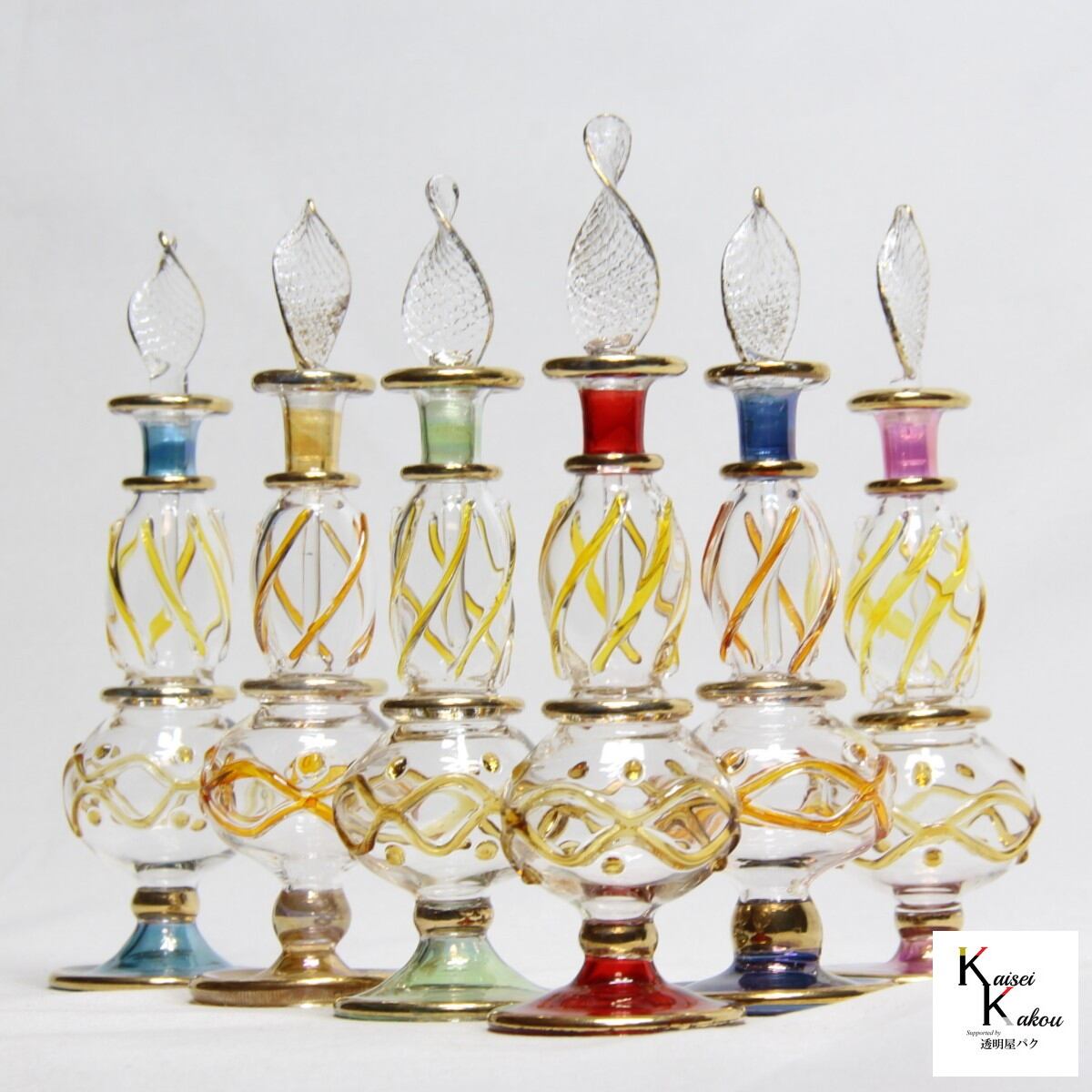 カラーは豊富にそろえてます! 「エジプトガラス デコラ クロス模様 ライトブルー・パープル系」 香水瓶 ファンシー エジプシャングラス ビン びん ミニガラス瓶 クレオパトラ パフュームボトル 香水ボトル ハーバリウム プレゼント アトマイザー ハンドメイド インテリア アロマ 切子 プレゼント カラーは豊富にそろえてます! 一つひとつ吹き、作り上げた香水瓶(パフュームボトル)です。 【カラー】 ライトブルー・パープル系 他に ブルー系 ピンク系 グリーン レッド系 イエロー のご用意もあります。 ※色味は個々により微妙に異なります。 お好みのハーバリウムお作りください。 ほかにも、好みの香水をいれるとゆっくりと揮発して、香りを楽しむこともできます。 一輪挿しにすることもできますし、用途はさまざまです。 商品詳細 伝統的な吹きガラスの製法で作っております。 フタには密閉性はございませんので、内容液をいれたまま傾けることがないようにお願いします。接着してお使いください。 ハンドメイド品につき、細かな装飾(金メッキや波模様を含む)や形、大きさ、色味が異なります。また、小傷や汚れ等ある場合もございます。 製品はとてもデリケートなため、接触、圧力、温度変化により、塗装やメッキがダメージを受けることがございます。お取り扱いには十分にご注意ください。 全く同じもののお届けはできませんので、あらかじめご了承ください。 【全体サイズ】 高さ約12cm±2cm また、本製品はハンドメイド品のため、世界に同じものはひとつとて、ありません。 【素材】本体:ガラス 5